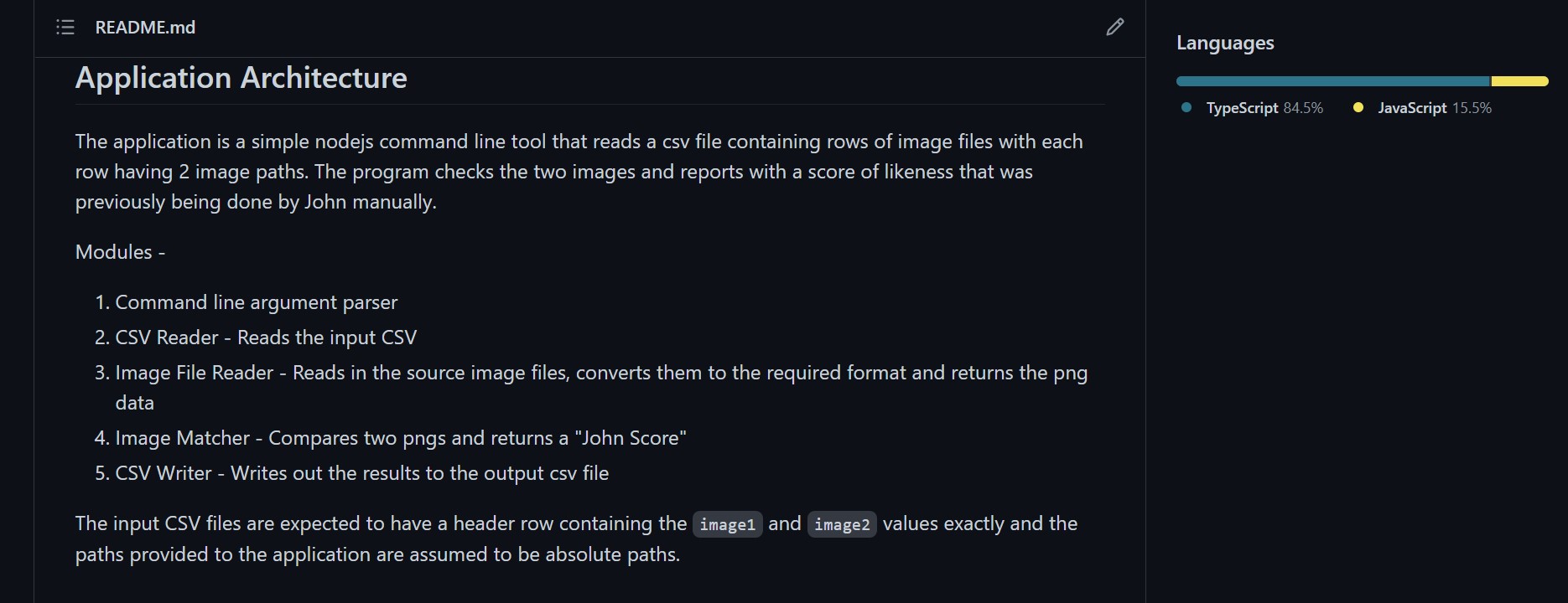 I built a simple cli tool to read csv files with image pairs and output how well they match in another file using fast-csv for reading/writing the files, sharpjs for image transformations and resemble js for visually matching the images.